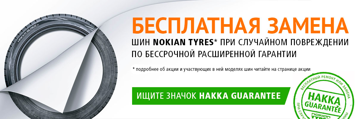 При покупке летних шин Nokian Hakka и зимних шин Nokian Hakkapeliitta для легковых автомобилей и внедорожников с 1 января по 31 декабря 2020 года – на шины распространяется Бессрочная Расширенная гарантия. Бессрочная Расширенная гарантия действует в течение всего срока эксплуатации шин (износ протектора не более 4 мм) и дает возможность бесплатно отремонтировать или заменить шину на новую.